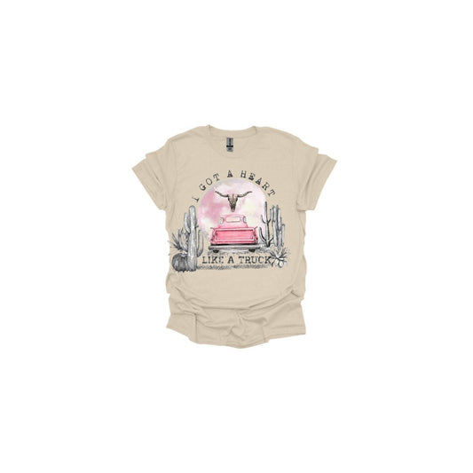 Moonlit Desert T-Shirt with Cow Skull and Pink Truck - Heart Like a Truck Message